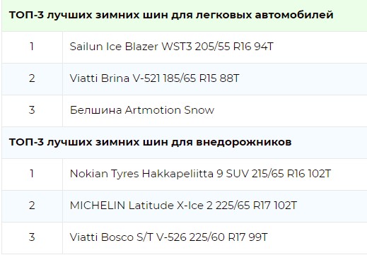 В сегменте легковых авто в тройку смогла пробиться модель Viatti Brina V-521 в типоразмере 185/65R15 88T. Основными сильными сторонами шин названы эффективность торможения, как на заснеженной дороге, так и в дождливую погоду. Одновременно она устойчива к аквапланированию, сохраняет мягкость резины в сильный мороз и обладает повышенной прочностью боковин.